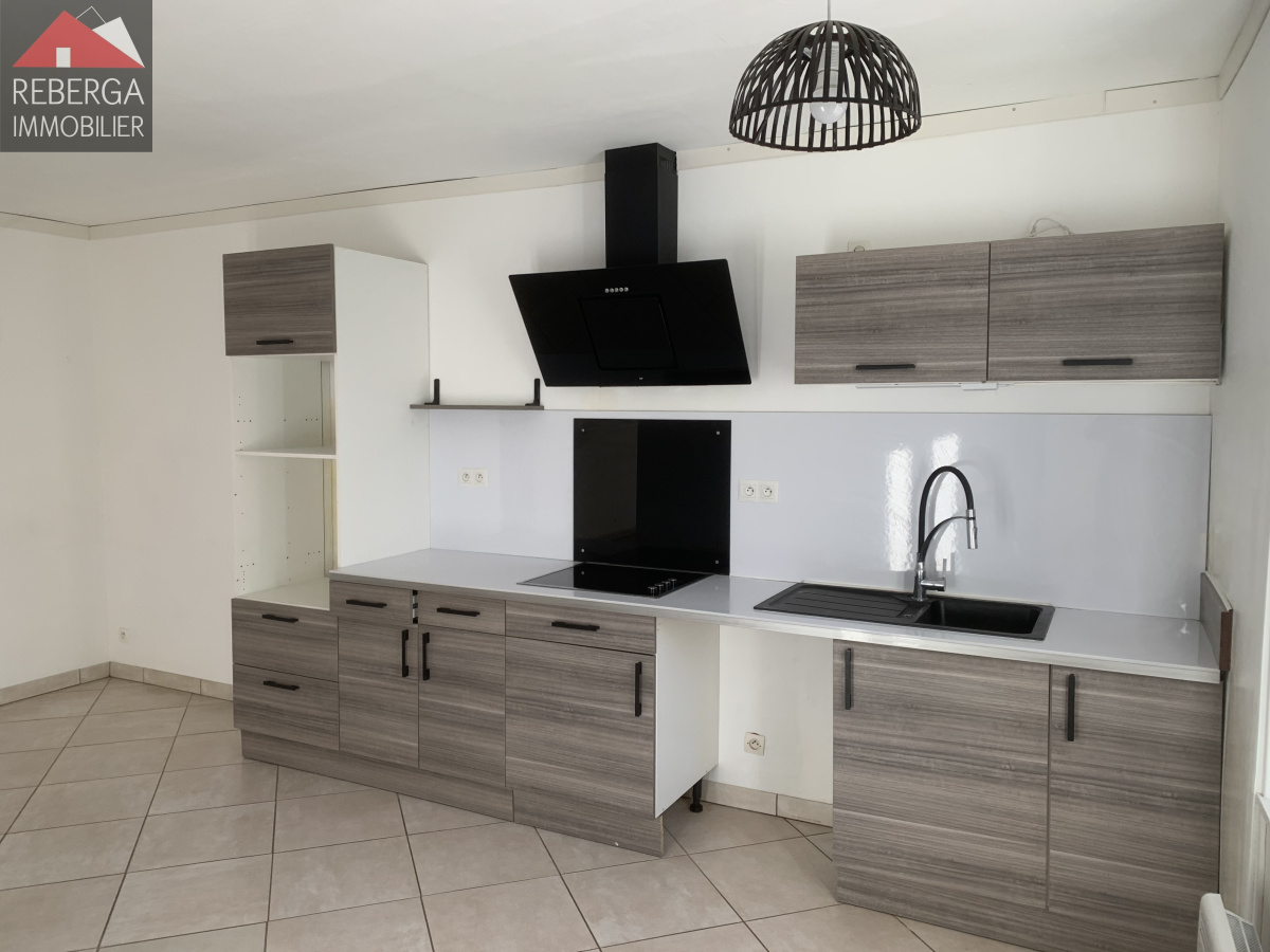 Maison de T3 composé d'une entrée, un séjour, une cuisine aménagée et équipée (plaque hotte et four), un wc et un espace de stockage. A l'étage, se trouve 2 chambres avec placard, une salle d'eau et un wc avec coin buanderie. Libre mi-décembre. PAS D'EXTERIEUR.