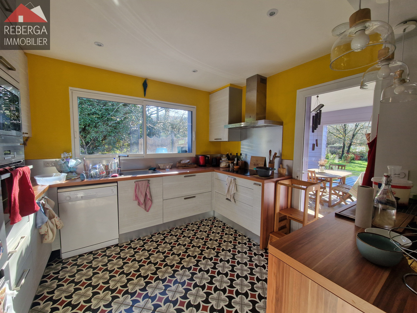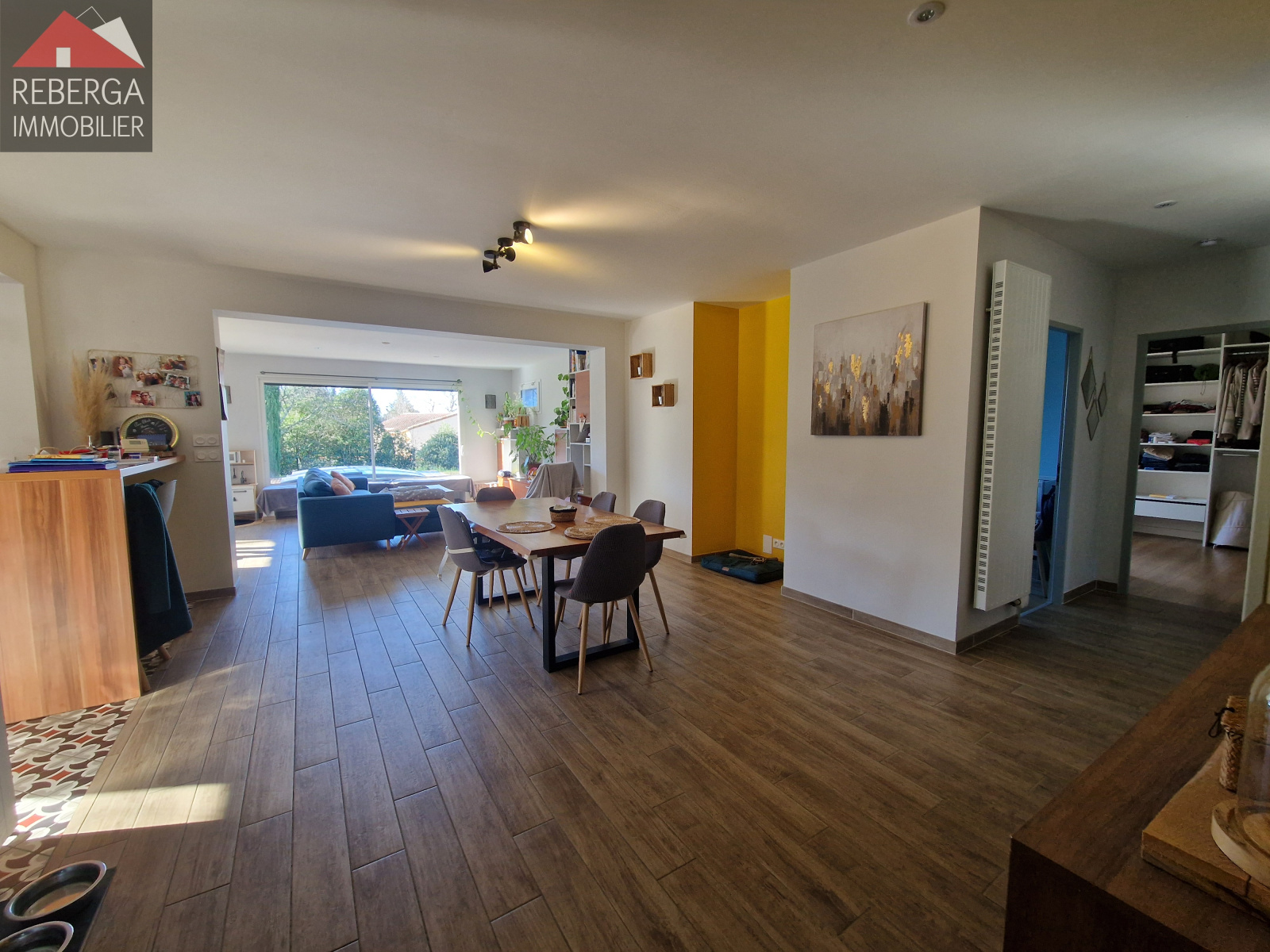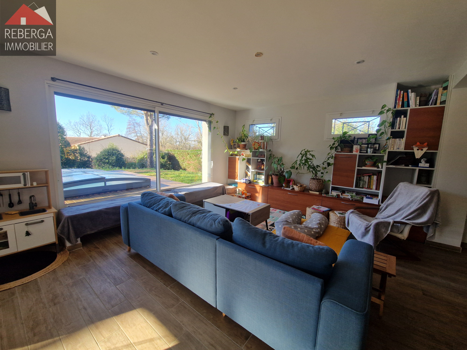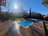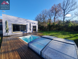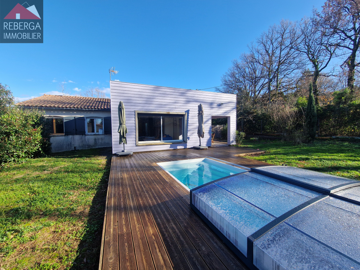 Maison de plain-pied, avec jardin entièrement clôturé comprenant: entrée avec placard, cellier, pièce de stockage, grand séjour d'environ 50m² avec coin cuisine équipée et aménagée, le tout donnant sur une terrasse couverte et le jardin clos avec piscine (au sel). Au coin nuit, 3 chambres avec rangements et une salle d'eau.