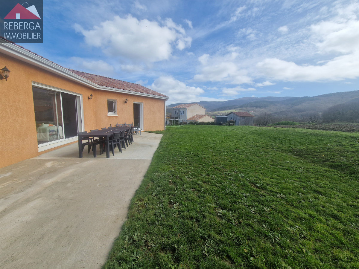 Maison de plain-pied de construction récente comprenant : entrée avec rangement, pièce de vie avec cuisine équipée et aménagée le tout donnant sur la terrasse et le jardin. Au coin nuit, 3 chambres avec placard de rangement et salle de bain double (douche + baignoire balnéo). Une buanderie/cellier complète le bien.