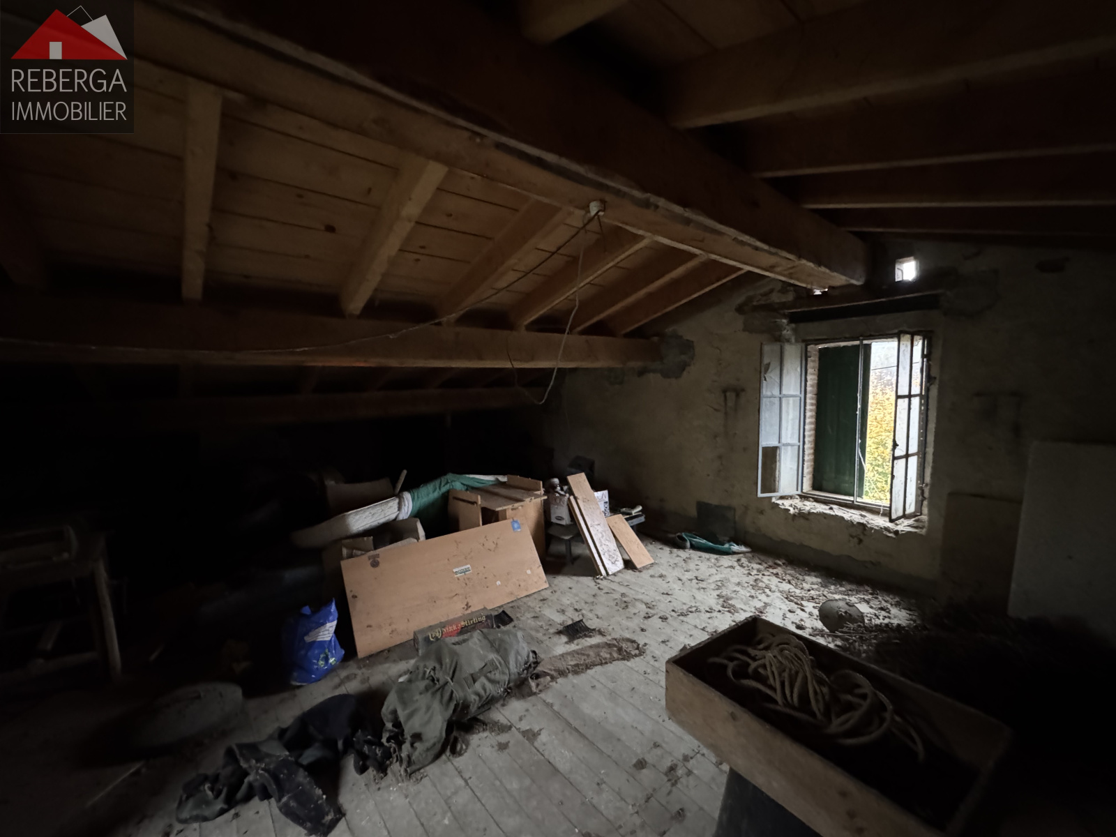 entrée, pièce de vie avec coin cuisine (cheminée), salle de bains, 2 chambres, grand grenier aménageable (2 chambres mansardées possibles ).