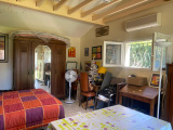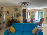 Le porche couvert ouvre sur la spacieuse pièce à vivre et l'espace cuisine, très lumineuse grâce à ses 3 portes fenêtres