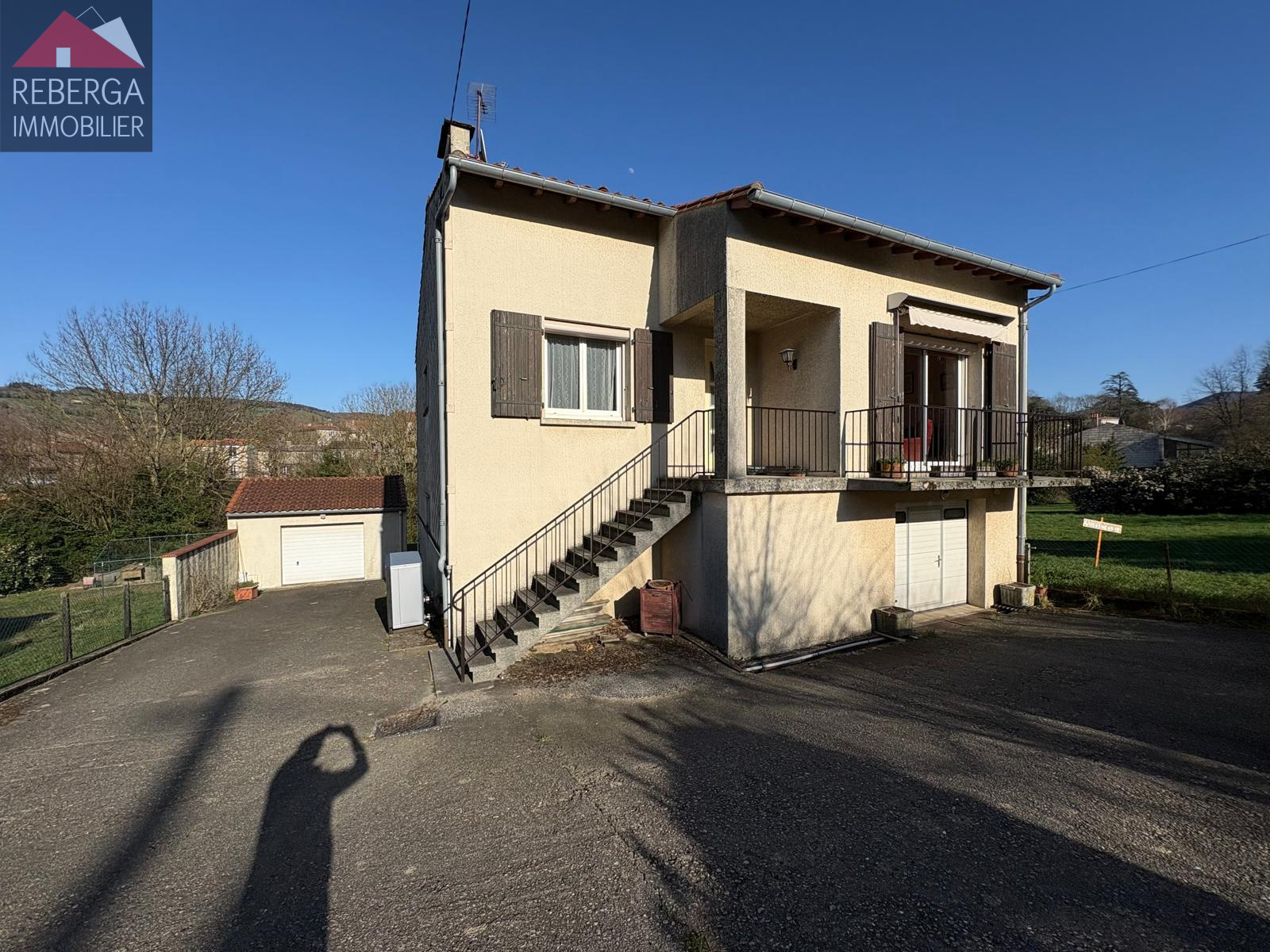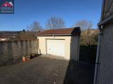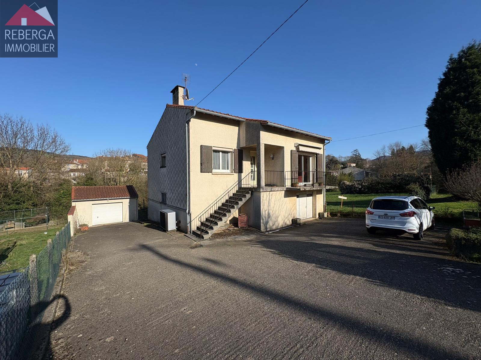 A l'extérieur, jardin arboré avec un garage non-attenant.