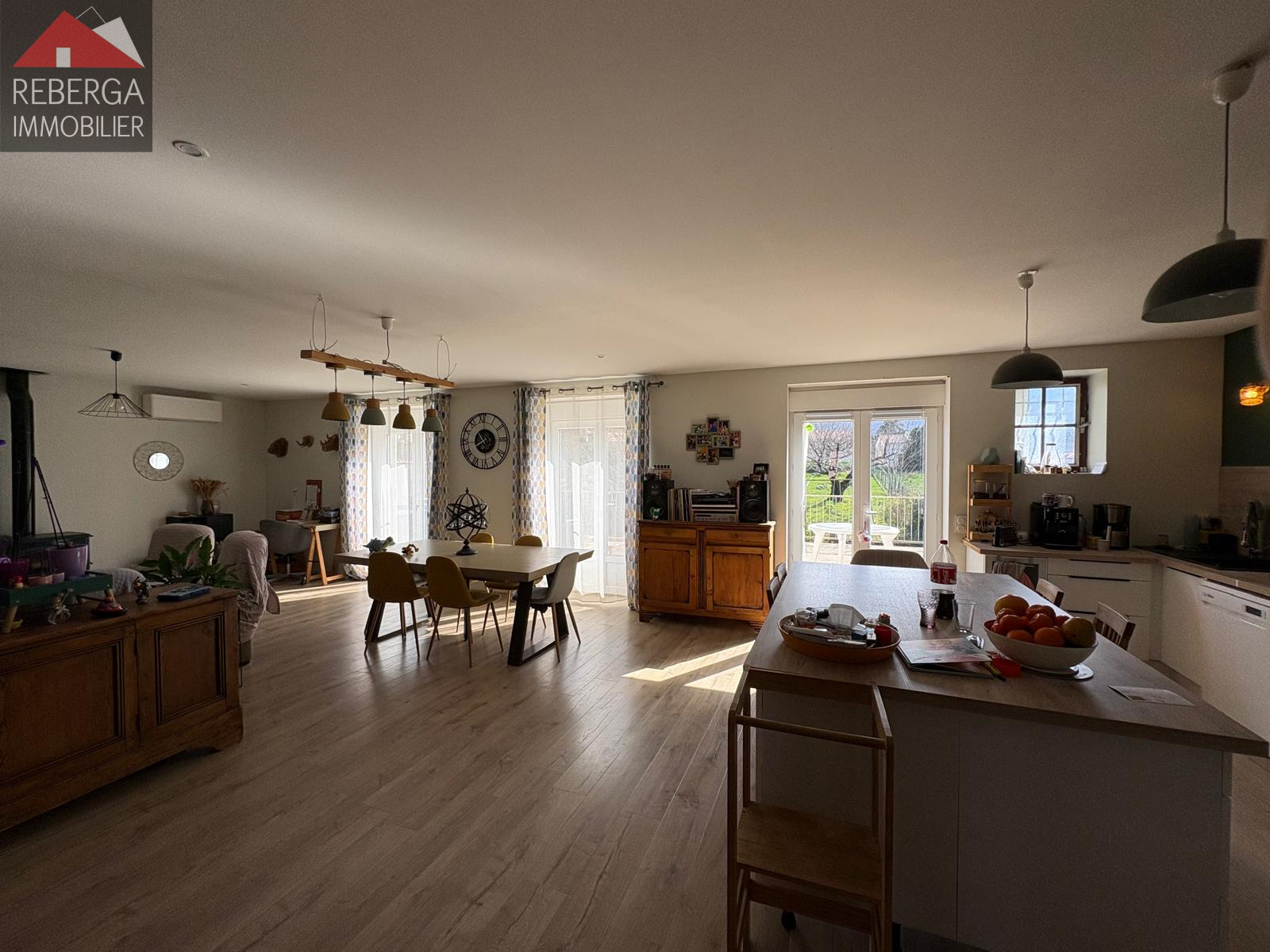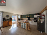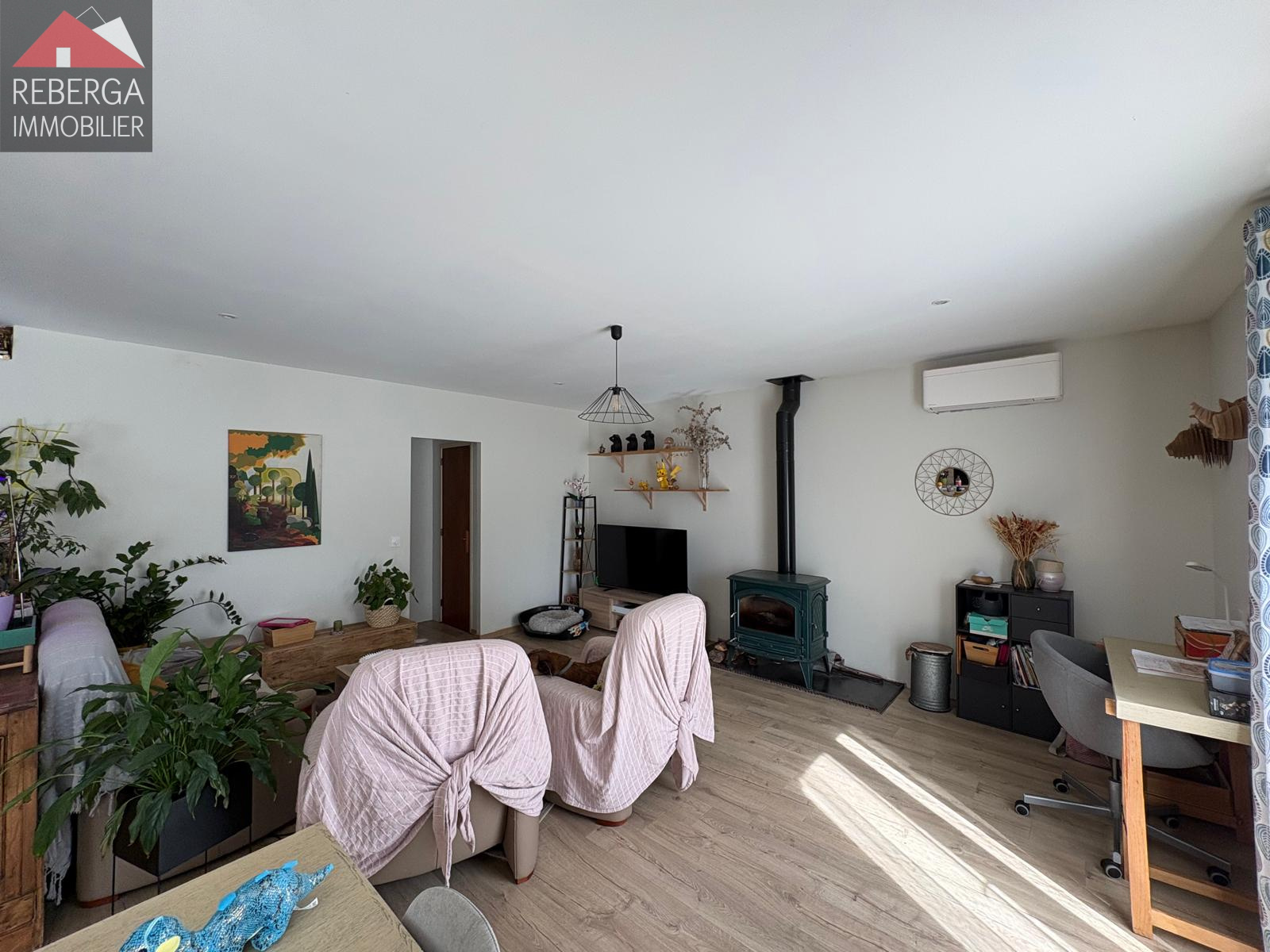 Au premier étage, grande pièce de vie lumineuse avec cuisine ouverte (poêle à bois et climatisation réversible) donnant sur une grande terrasse et le jardin, deux chambres, une salle d'eau et un wc.